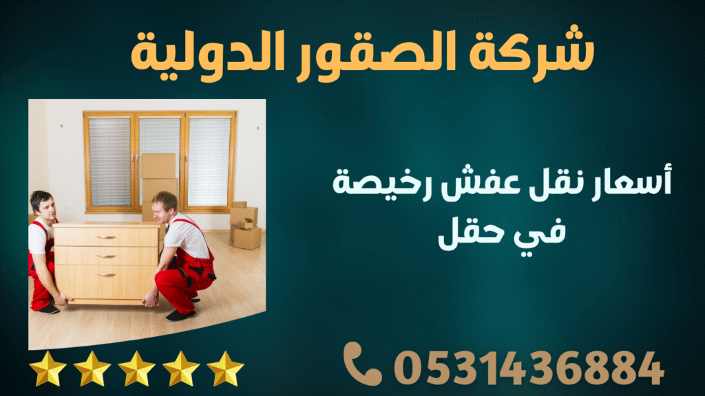 إذا كنت تبحث عن أسعار نقل عفش رخيصة في حقل دون التنازل عن الجودة، فإن شركة الصقور الدولية تقدم لك الحل الأمثل. نحن نوفر خدمات نقل عفش متكاملة تشمل الفك، التغليف، والتركيب بأسعار منافسة تناسب جميع الميزانيات، مع الحفاظ على أعلى معايير السلامة والاحترافية. فريقنا من العمالة المدربة يستخدم أفضل أدوات النقل والتغليف لضمان حماية العفش من أي تلف أو ضرر أثناء التحرك. كما نمتلك أسطول سيارات مجهز لنقل الأثاث بأمان وسرعة داخل حقل أو إلى أي منطقة أخرى. اتصل الآن على 0580471180 واستفد من أفضل خدمات نقل العفش بأقل الأسعار مع الصقور الدولية.